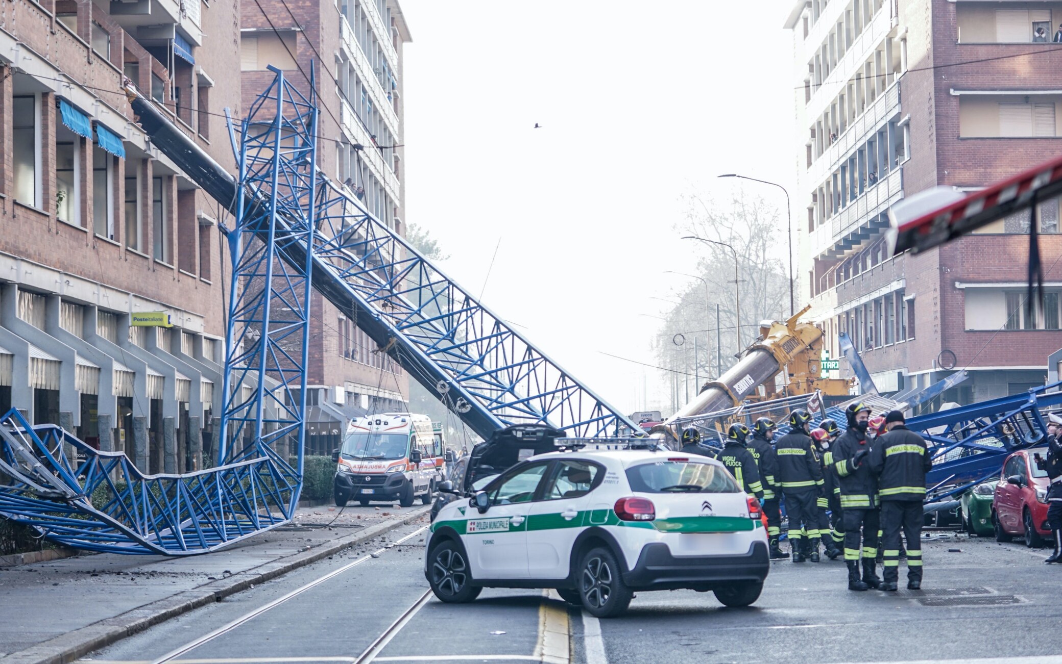 Tragedia a Torino dove una gru da cantiere è caduta appoggiandosi su un palazzo di sette piani in via Genova.